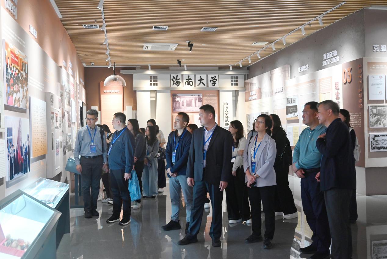 在校史馆,交流团通过珍贵的历史影像资料,深入了解学校的发展历程与办学传统。在美术馆,黎锦、船型屋等特色展品,生动展现了海南非物质文化遗产的独特魅力。最后交流团步入大学科技园,参观海南省激光技术与光电功能材料重点实验室,沉浸式体验了VR技术与“圈圈AI智慧体育”项目,对我校在科研创新、学科融合及成果应用方面取得的成效给予高度评价。